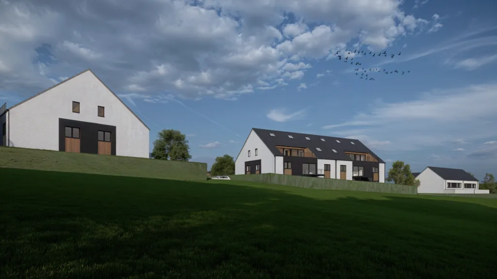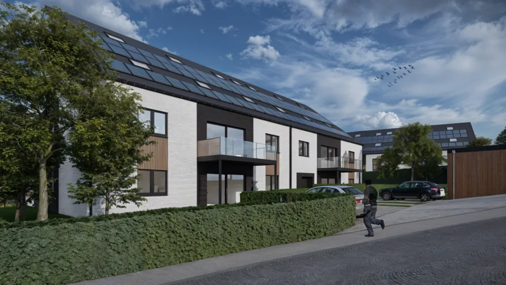 Le projet prévoit la construction de 22 logements répartis en deux maisons unifamiliales de 3 chambres et deux immeubles de dix appartements (dont des simplex et duplex de 1 à 3 chambres). Les bâtiments s’organisent le long de la Chaussée de la Gare, reconfigurée en asphalte, avec un trottoir pour améliorer la sécurité piétonne. Des parkings végétalisés séparent les immeubles et créent des percées visuelles, tandis que l’arrière du terrain reste libre de construction pour préserver la zone agricole.