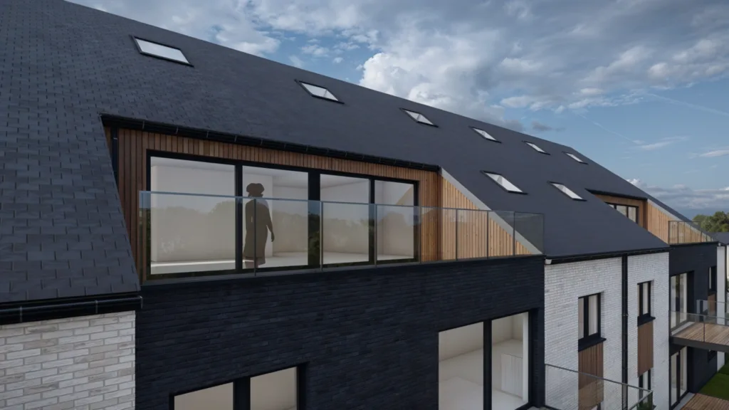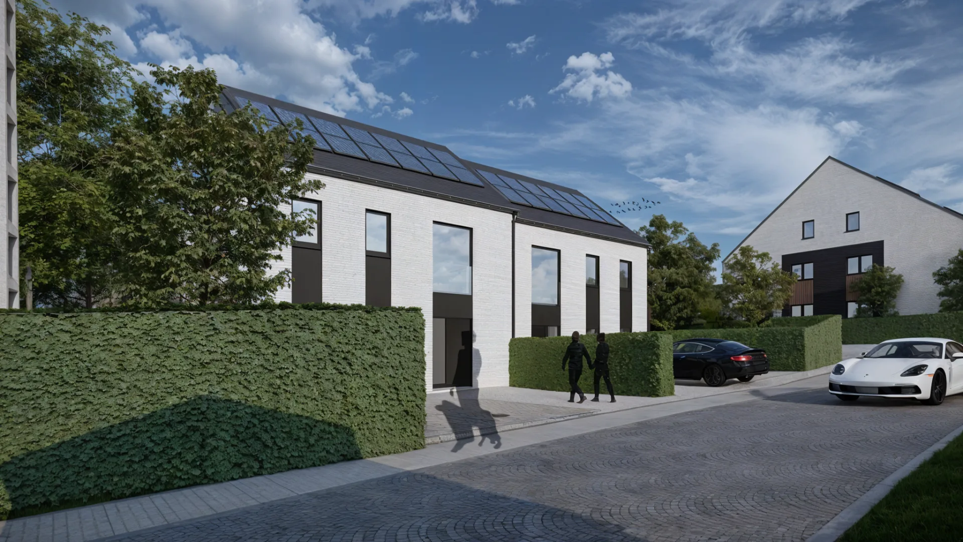 Les façades des maisons sont en briques gris clair, avec des baies horizontales côté jardin, tandis que les immeubles, également en briques, sont dotés de bardages en bois et d’ouvertures verticales. Les parkings, aménagés avec des dalles gazon et bordés de végétation, garantissent l’intégration paysagère du projet, tout en offrant des espaces de stationnement pour les résidents et visiteurs.