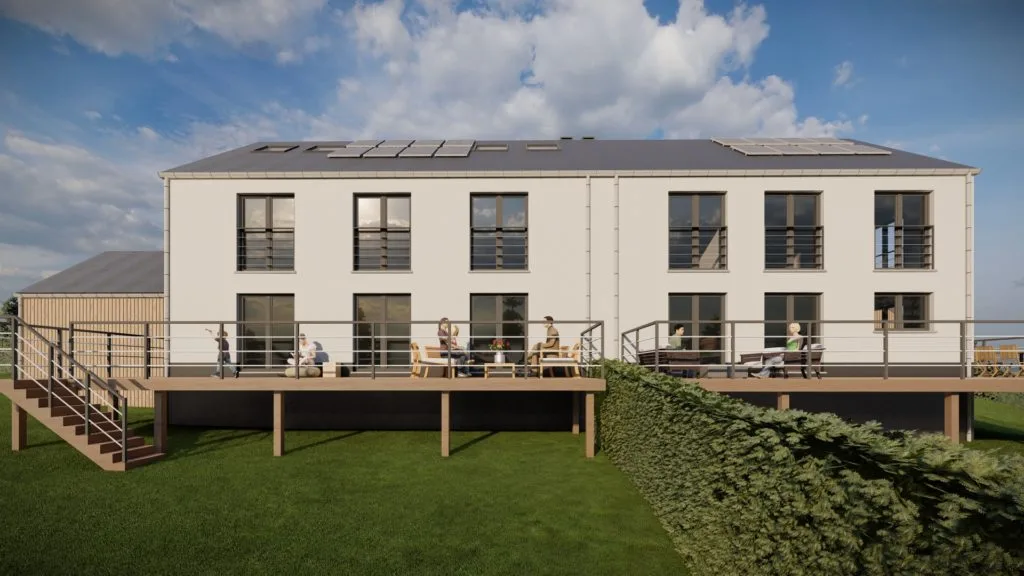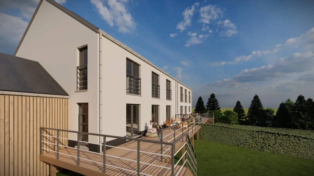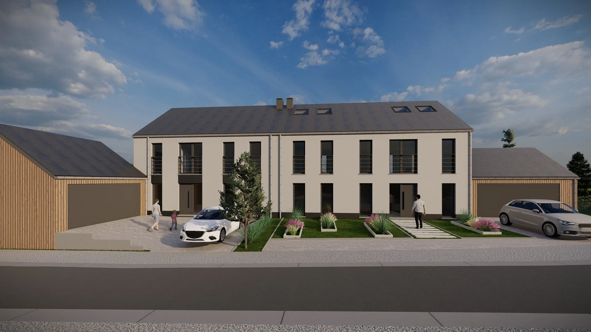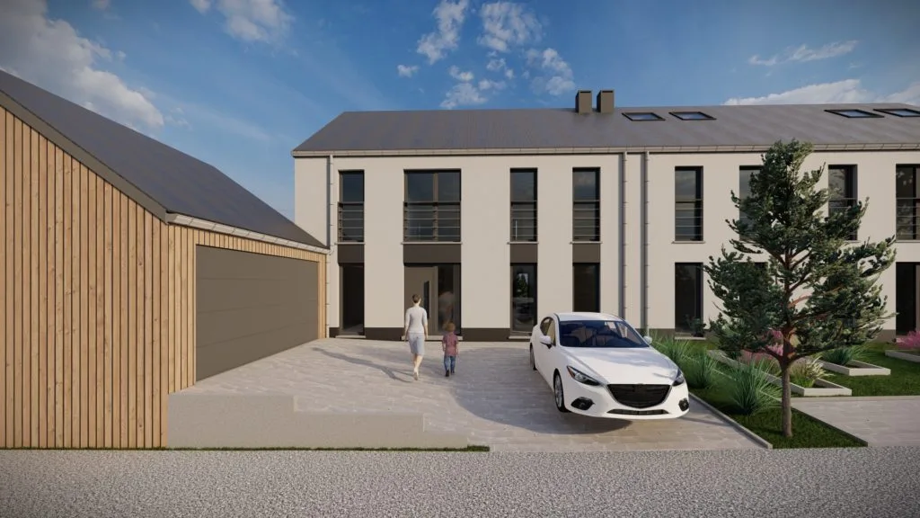 Le projet prévoit deux habitations mitoyennes de 3 façades avec garages en bardage bois, en retrait de 6 m de la voirie. L’architecture mélange crépi blanc et noir, châssis gris anthracite, et s’intègre harmonieusement au cadre existant.