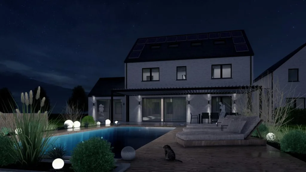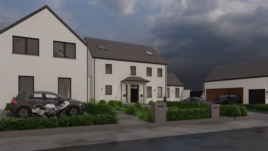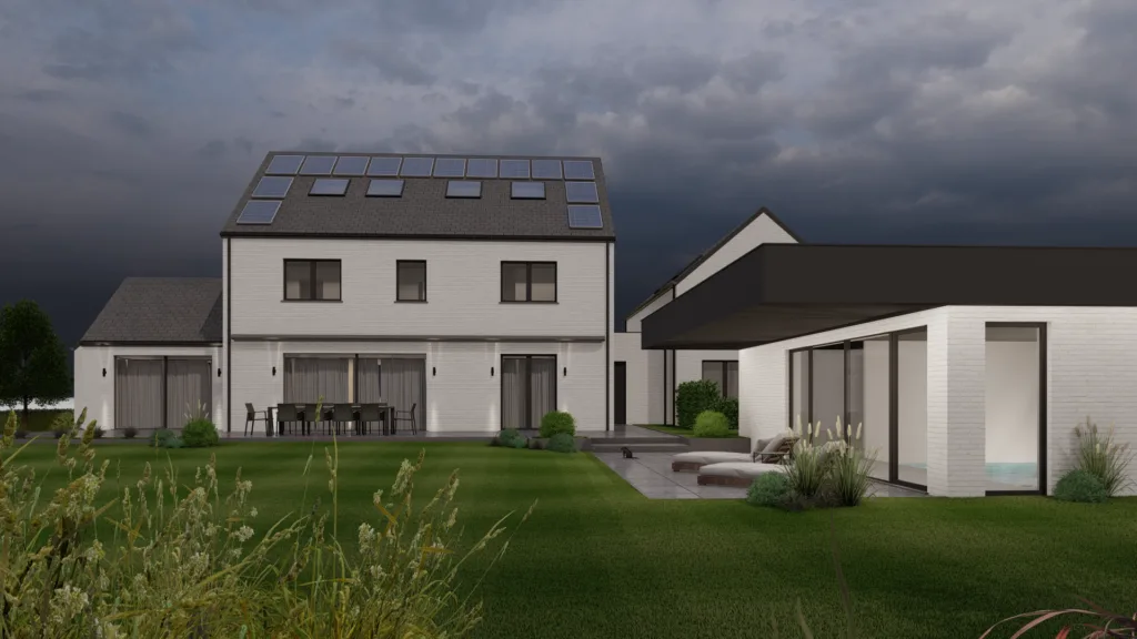 Le projet, situé à Walhain dans un cadre rural, prévoit une maison 4 façades avec un espace professionnel, un carport et une piscine. En retrait par rapport à la rue, la maison combine tradition et modernité avec des volumes variés et des matériaux harmonieux.