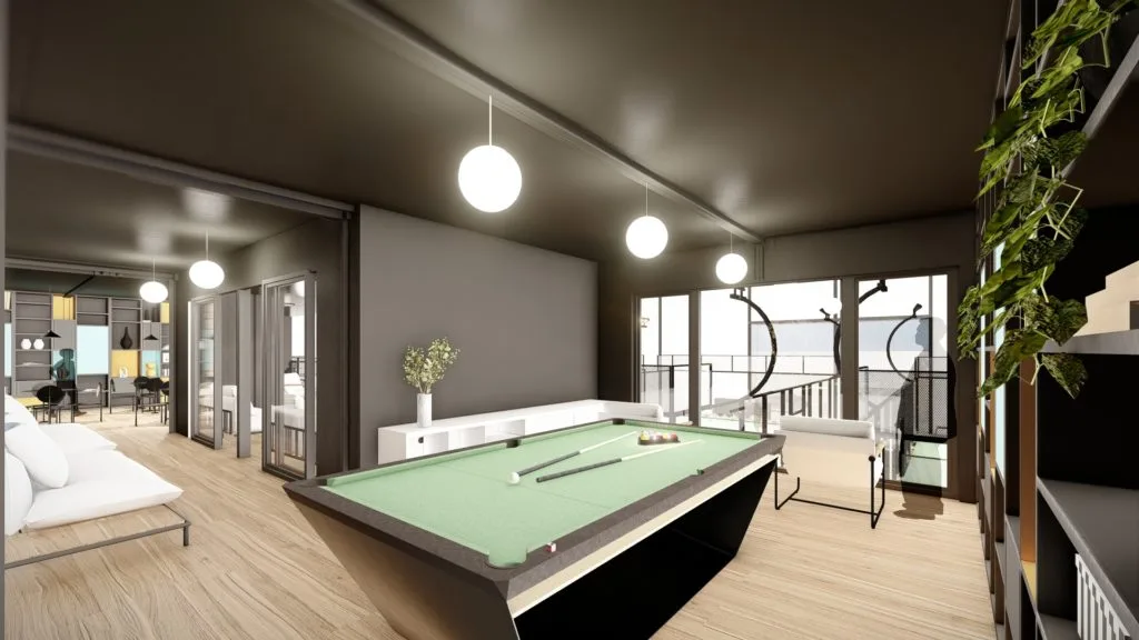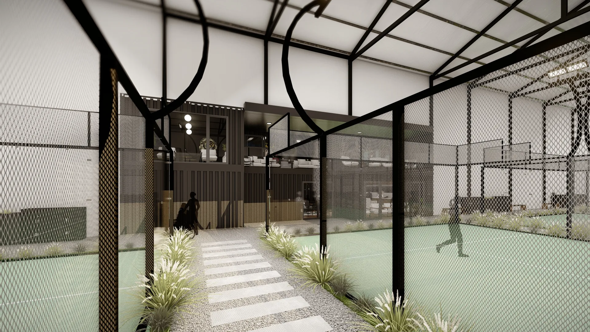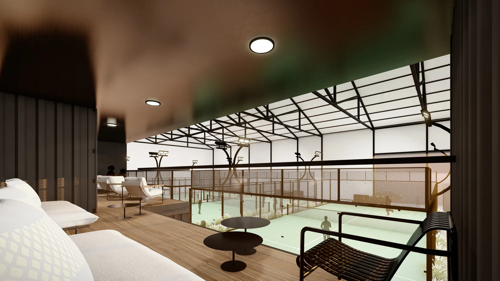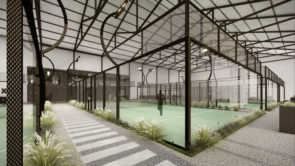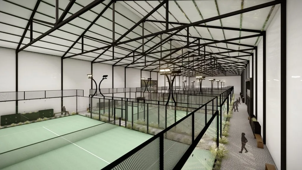 Ce projet de rénovation convertit un bâtiment industriel en complexe sportif et récréatif dédié au padel. L’intérieur a été repensé pour accueillir six terrains de padel, une salle de jeux avec bar et un espace d’accueil. Les structures principales ont été conservées, tandis que l’espace intérieur a été décloisonné pour permettre une organisation optimale des différentes zones.
