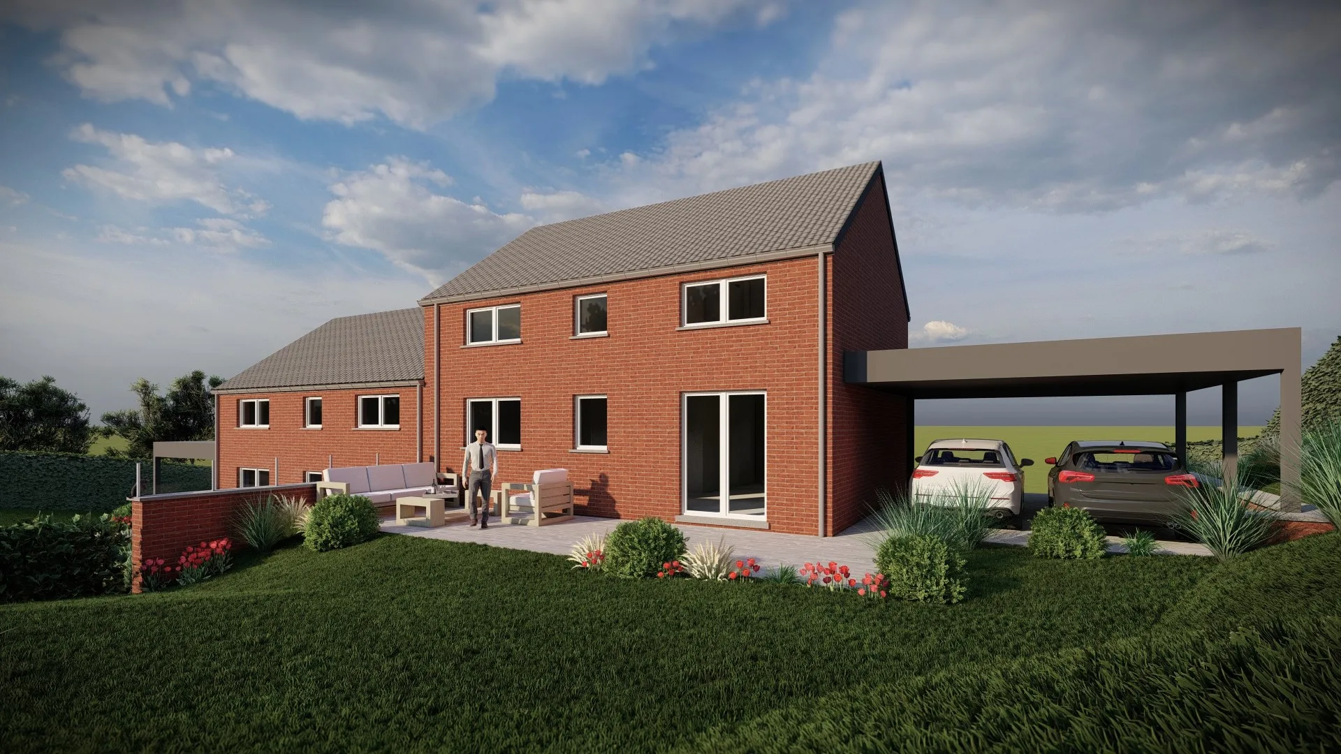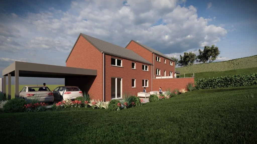 Le projet concerne la création de deux habitations unifamiliales mitoyennes à trois façades, implantées en retrait de la voirie pour s’harmoniser avec le contexte local. Les deux maisons, compactes et fonctionnelles, adoptent une architecture mêlant classique et moderne, avec des matériaux en brique rouge nuancé blanc et des ouvertures adaptées à chaque espace.