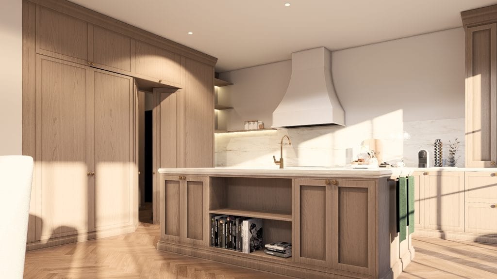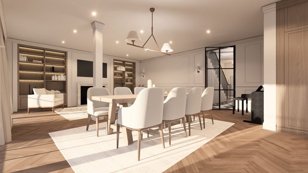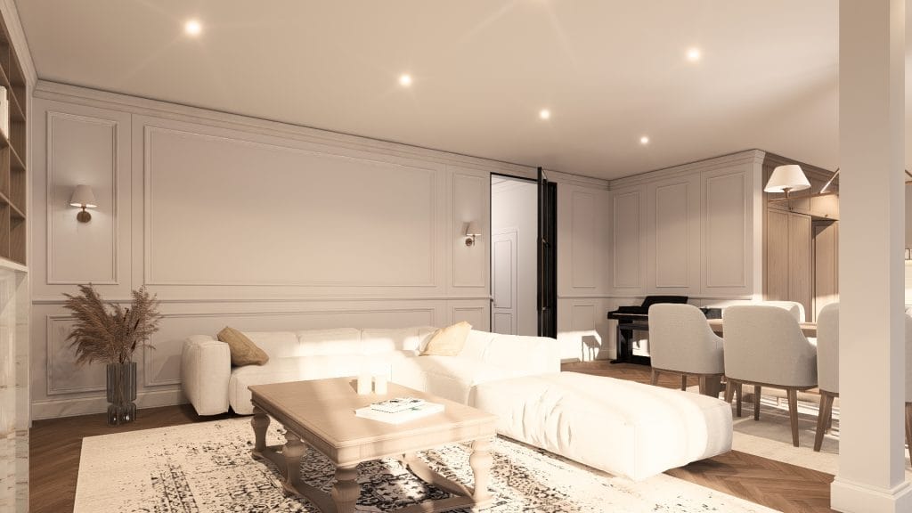 Un intérieur lumineux et élégant où les codes classiques — moulures, parquet en chevron — rencontrent une écriture contemporaine. Les espaces ouverts, structurés par des menuiseries intégrées et une verrière, offrent fluidité, convivialité et mise en valeur de la lumière naturelle.