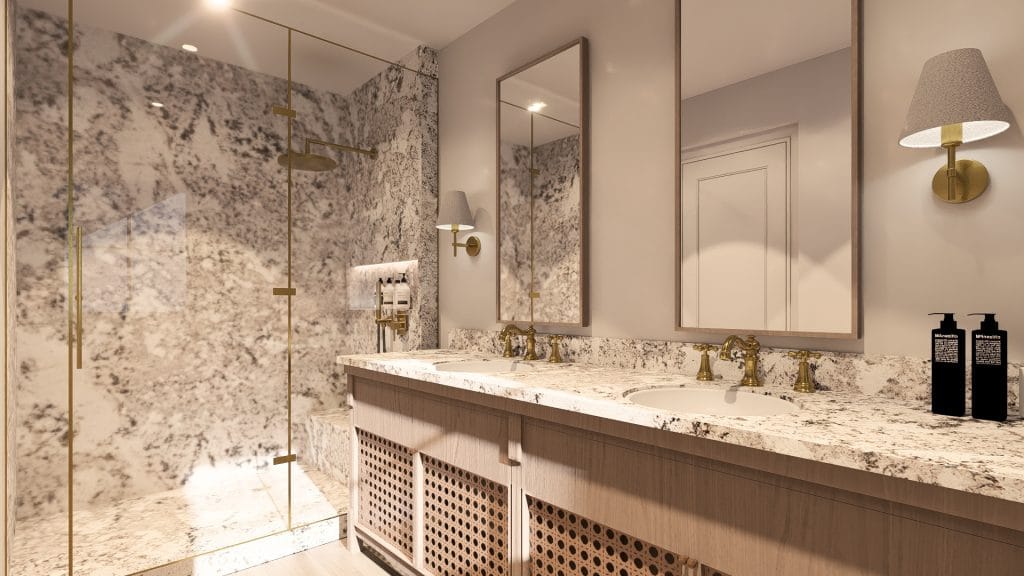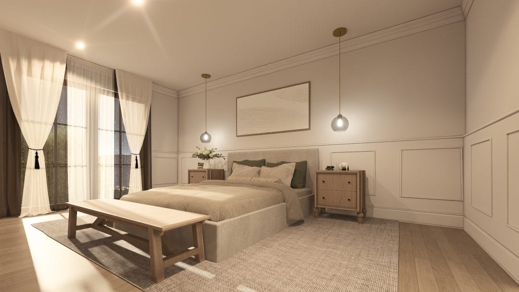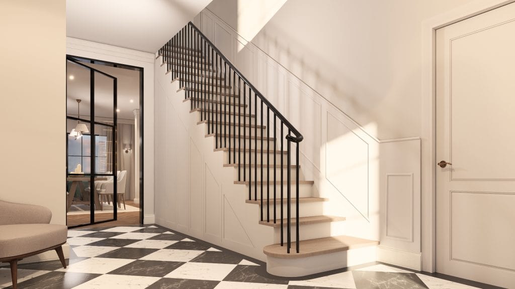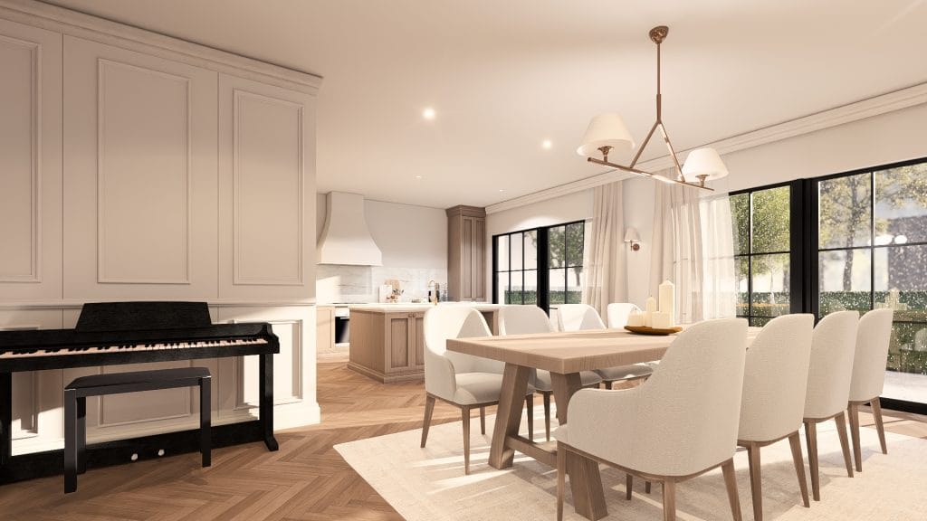 L’aménagement intérieur propose une relecture contemporaine des codes classiques, créant une atmosphère élégante et lumineuse. Les espaces de vie s’organisent en plan ouvert, favorisant la fluidité des circulations et la convivialité, avec une salle à manger centrale.