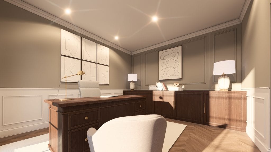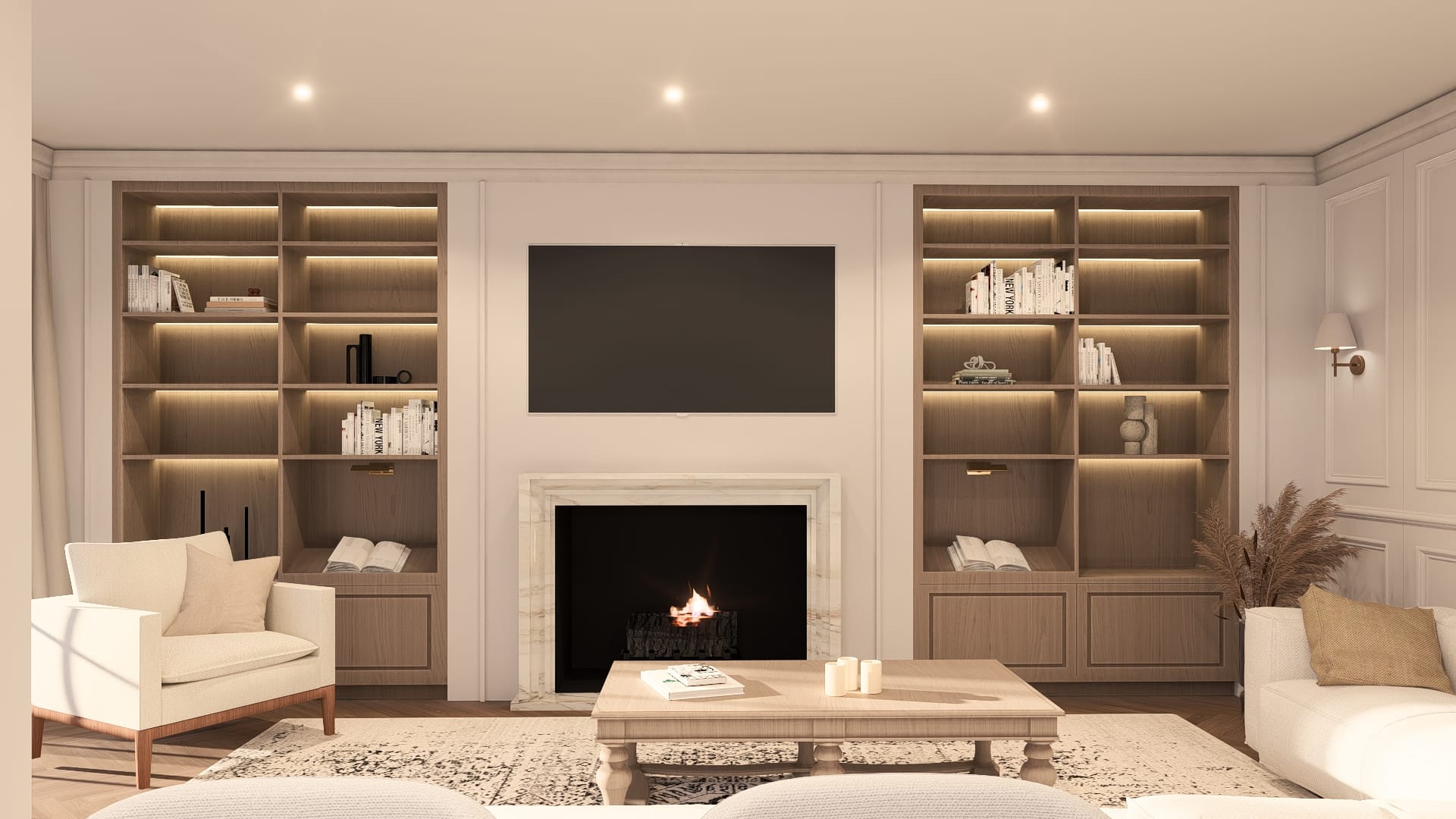Les moulures murales et le parquet en chevron apportent du caractère, tandis que le mobilier épuré et les teintes claires renforcent la sensation d’espace. Les menuiseries intégrées, avec éclairage indirect, structurent les volumes et ajoutent une dimension chaleureuse.