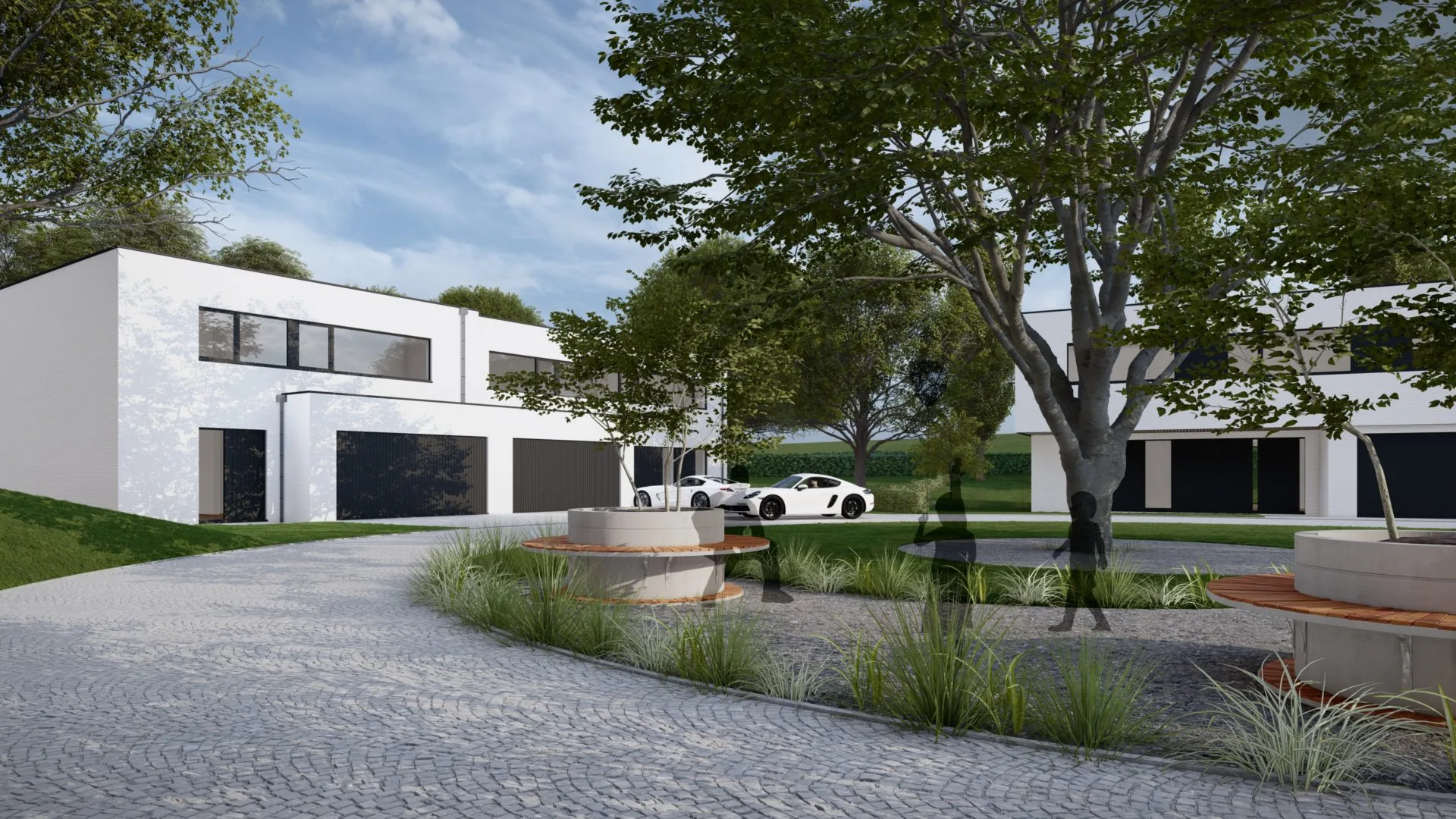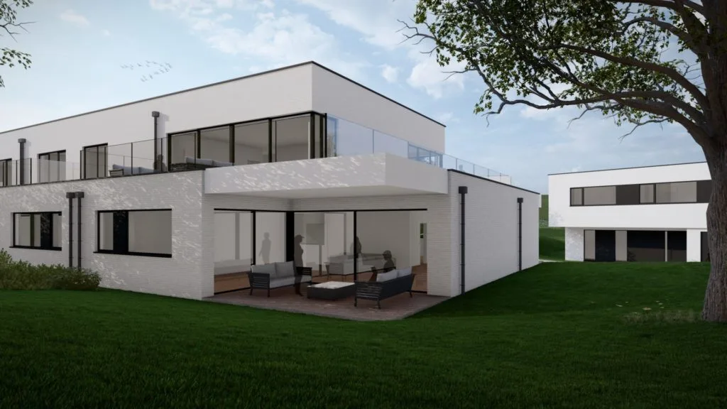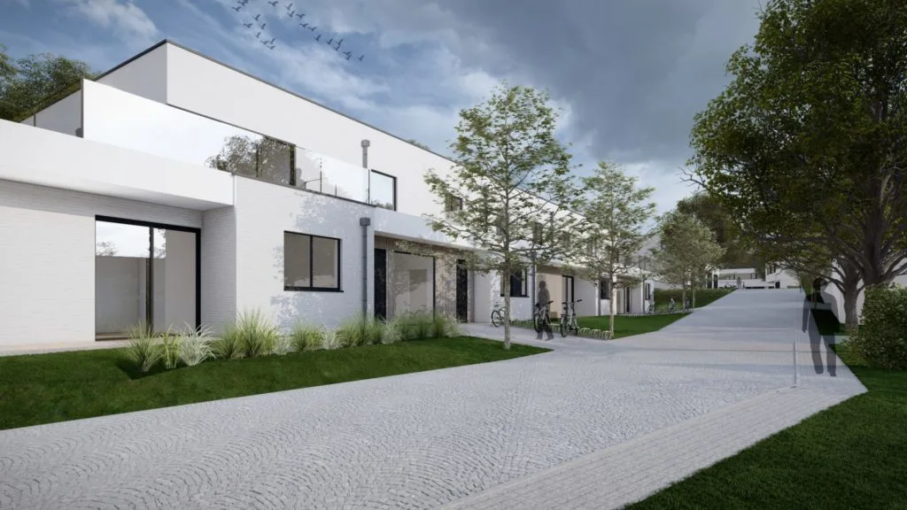 Construit en contrebas de la voirie, le projet s’intègre harmonieusement au paysage grâce à son implantation discrète et ses toitures végétalisées. Les bâtiments adoptent une architecture contemporaine avec des toitures plates utilisées comme terrasses ou balcons. Les façades combinent briques blanches, bardage en aluminium et bois, renforçant l’esthétique naturelle. Les espaces extérieurs comprennent des chemins perméables, des parkings pour résidents et invités, et une cabine électrique dissimulée par de la végétation, garantissant un aménagement fonctionnel et respectueux de l’environnement.