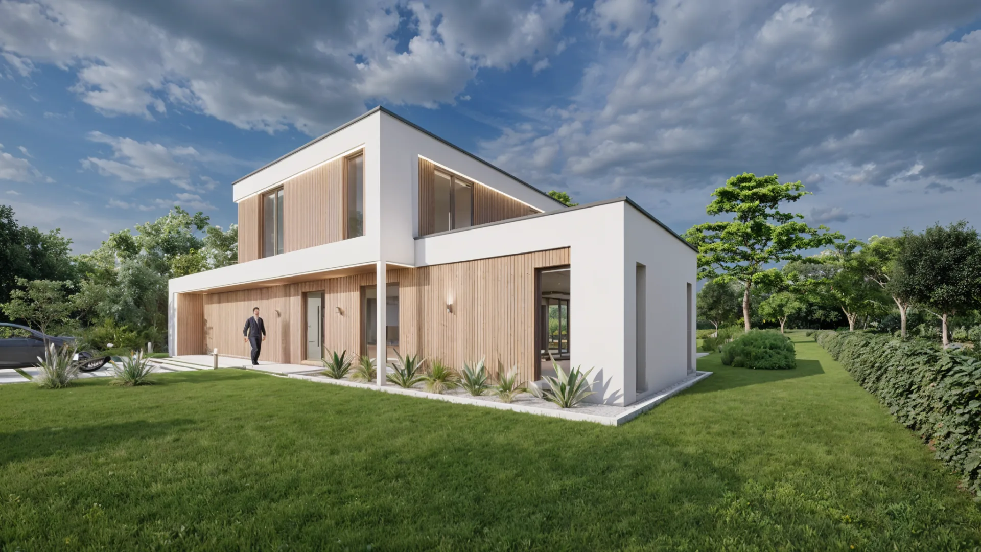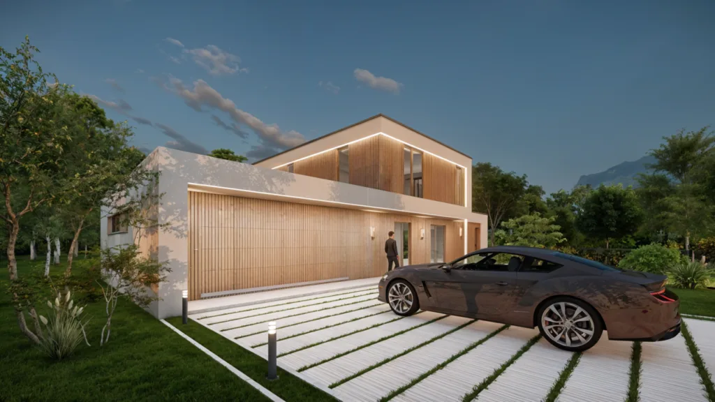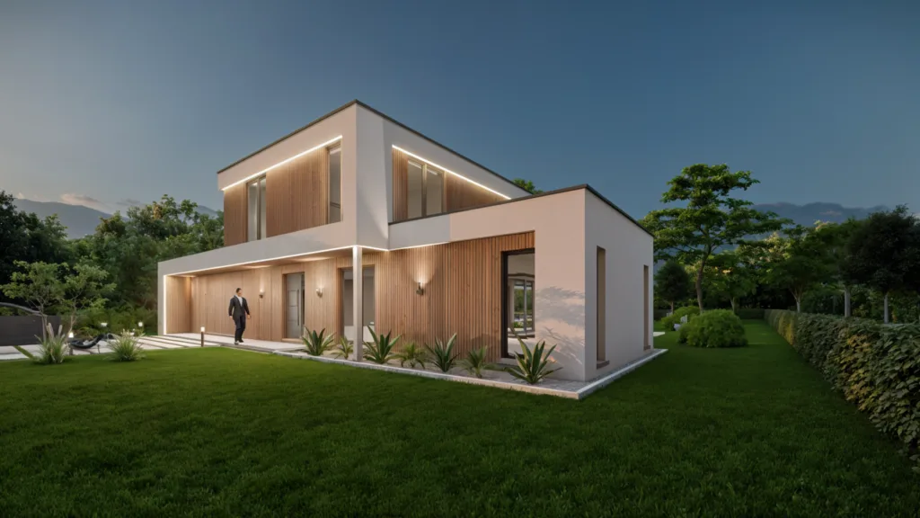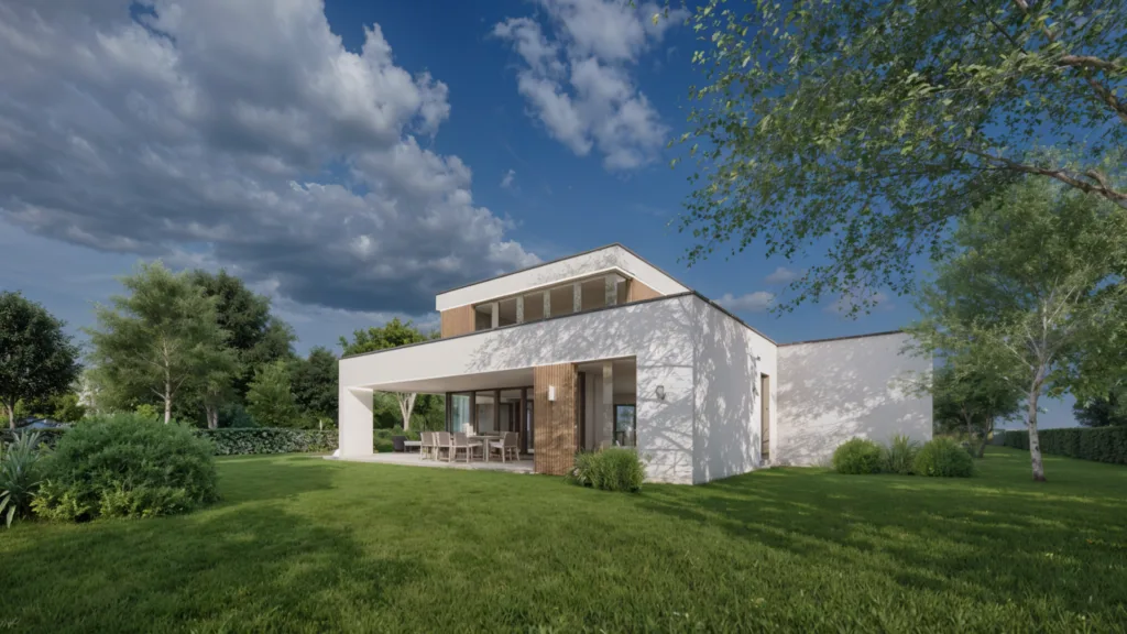 Cette maison contemporaine est un bâtiment moderne et élégant, avec des lignes épurées et une façade mêlant bois et enduit blanc. Elle comprend trois chambres, deux salles de bain, un garage, une buanderie et un bureau, entourée d’un jardin verdoyant.